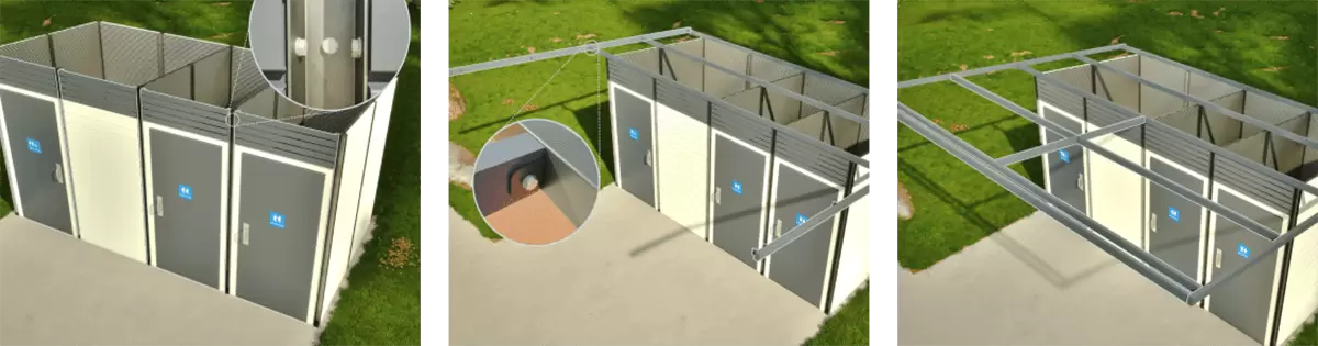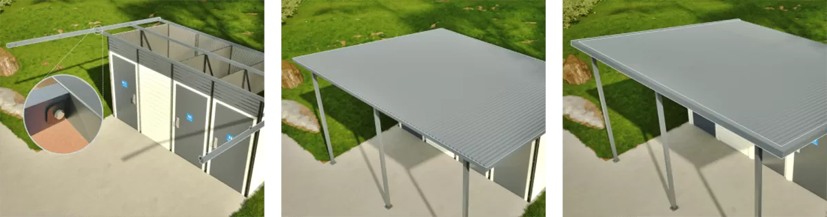 Lift roof purlins safely into position above walls, and bolt through brackets on top of each joiner channel into thread inserts in the purlins. Then fit rafters to purlin ends, also bolted into thread inserts. Fit verandah columns to purlins using the same method, and bolt through base plates in concrete with chem-set anchors. Fit roof sheets to purlins using colour match tek screws provided.