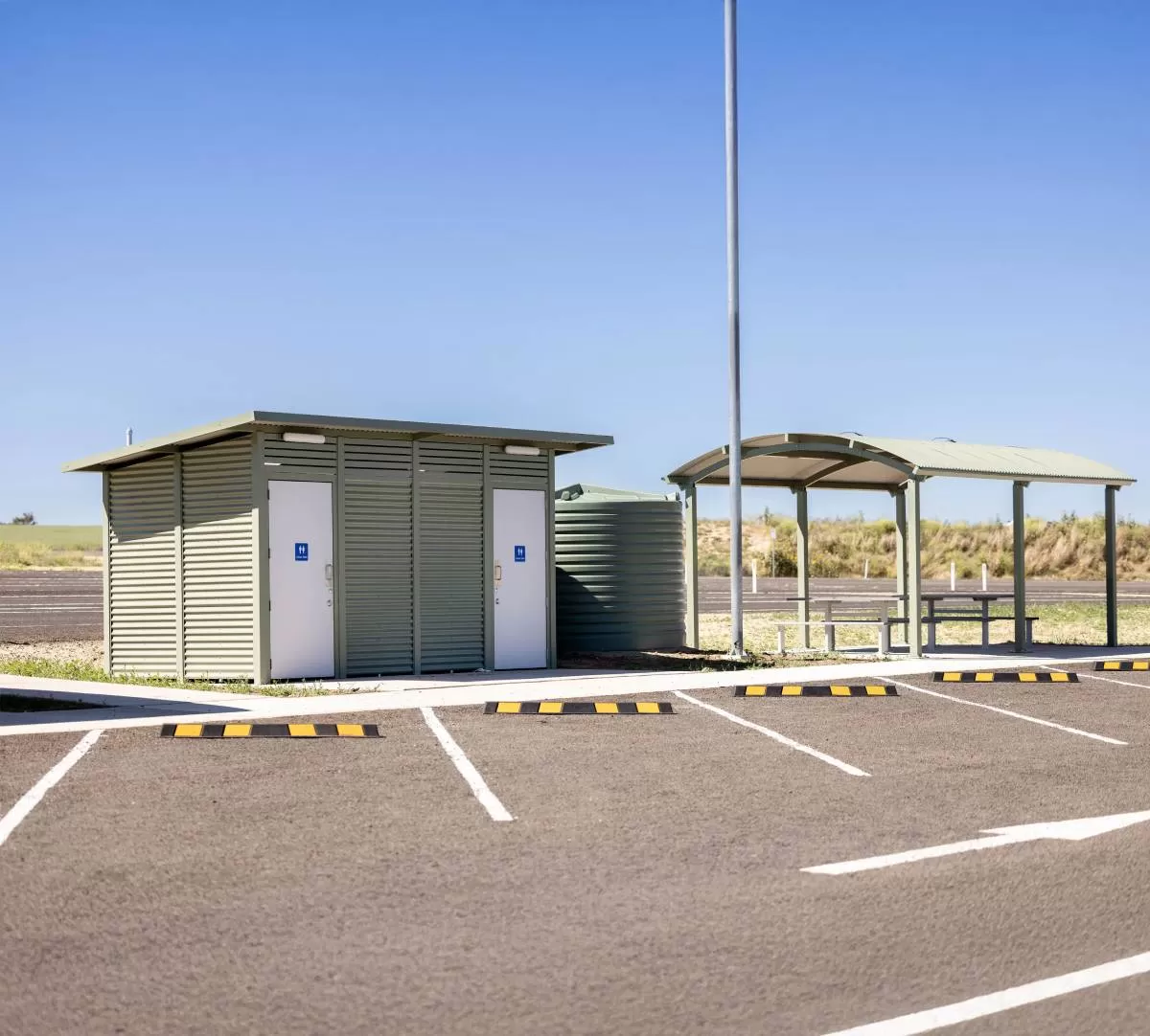 Good lighting will help deter vandalism and help road users feel safe while at the rest stop. A shade shelter attached to the toilet facilities themselves also improves usability.