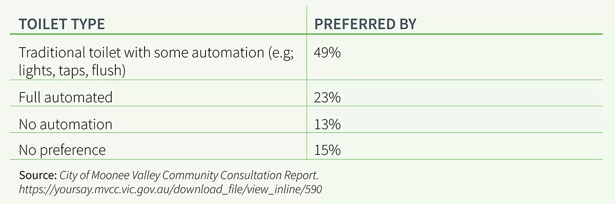 The on-the-ground experience suggests otherwise. The City of Moonee Valley council in Victoria recently conducted an extensive ratepayers survey about their preferred level of automation in public toilets and some of the comments were telling.
