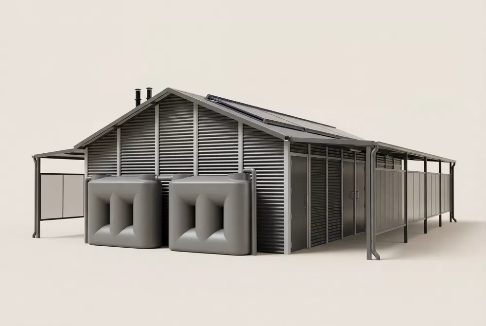 Pre-clad panels, inside and out. Doors pre-hung in frames. Prefab for simple, fast and accurate bolt together onsite construction -