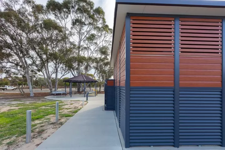 The Shire engaged us initially to manufacture and install the larger Changing Places and toilet building. The building required the incorporation of an accredited Changing Places cubicle, along with other toilet cubicles to cater for all mobility levels. The building colour scheme includes timber-look cladding to connect with the natural Katanning landscape. For more information about Changing Places, check out our blog post here.