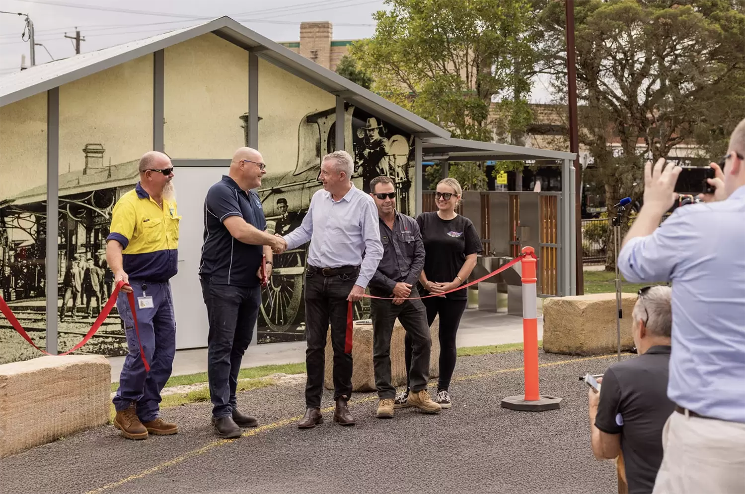 Railway Station: In South Lismore, the new amenities serve users of the Northern Rivers Rail Trail. Nine cubicles (including ambulant and wheelchair accessible) were installed with heritage-themed graphic panels featuring a 1900s photograph of the original station, a nod to local identity.