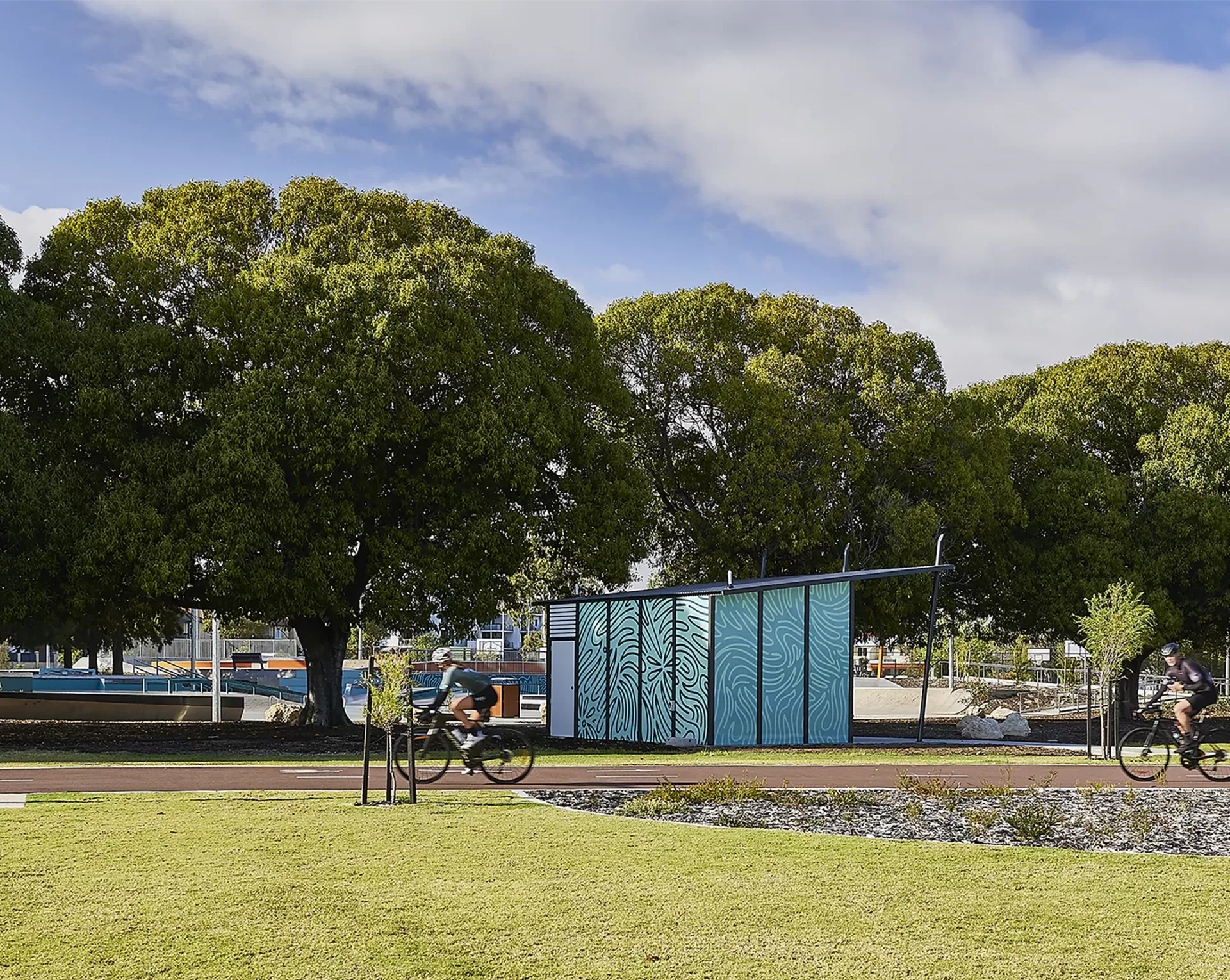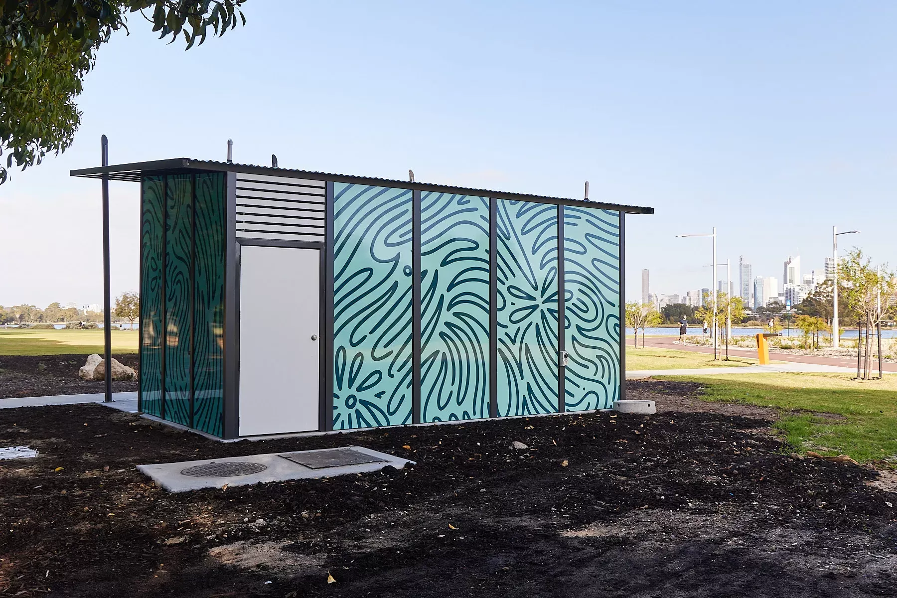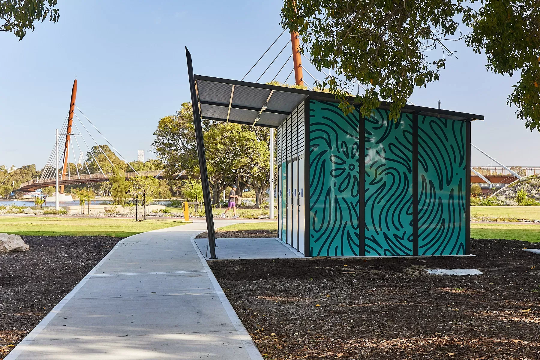 McCallum Park sits at the Victoria Park end of the newly opened Boorloo Bridge, a landmark connection across the Swan River in Perth. Adjacent to the bridge, the park has undergone a $4.8 million redevelopment that includes upgraded basketball courts featuring stunning full-court murals by artists Kamsani Bin Salleh and Chris Nixon, alongside a competition-ready skate plaza, BMX pump track, junior scooter circuit, and active community spaces surrounded by new landscaping and spectator areas. As the park redevelopment progressed, the need for essential amenities became clear. Visitors to this growing community hub required accessible toilet facilities to support extended stays and community gatherings.
