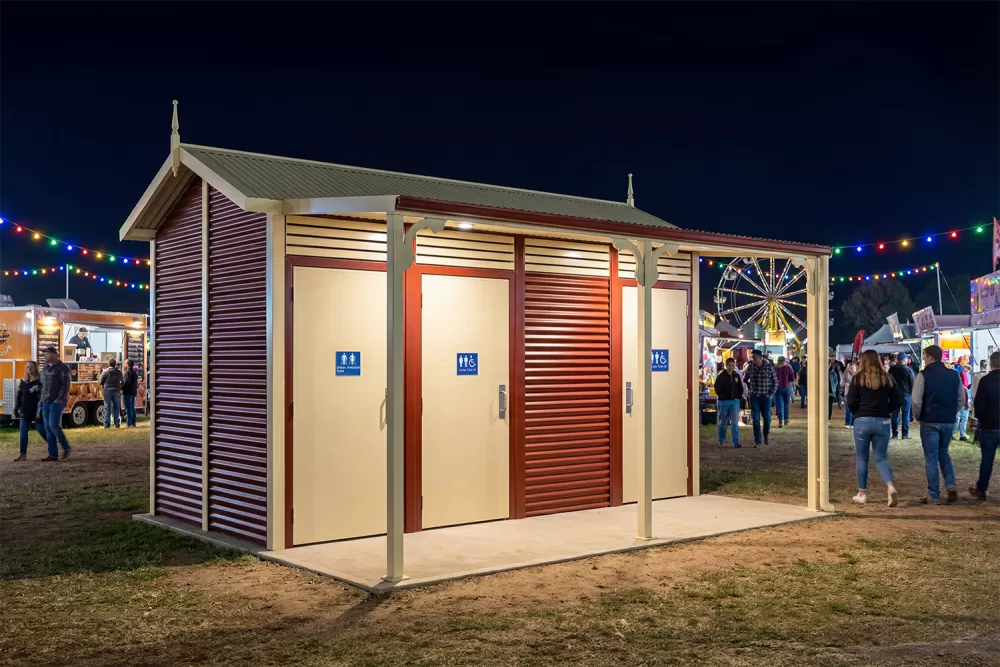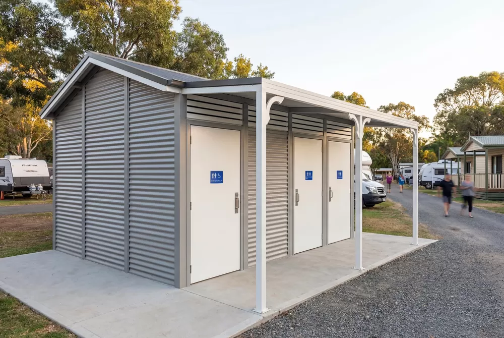 The Burton Toilet Building delivers classic form with a gable roof and trimming, designed to fit well in traditional surroundings. This building can be offered with or without the decorative veranda brackets.